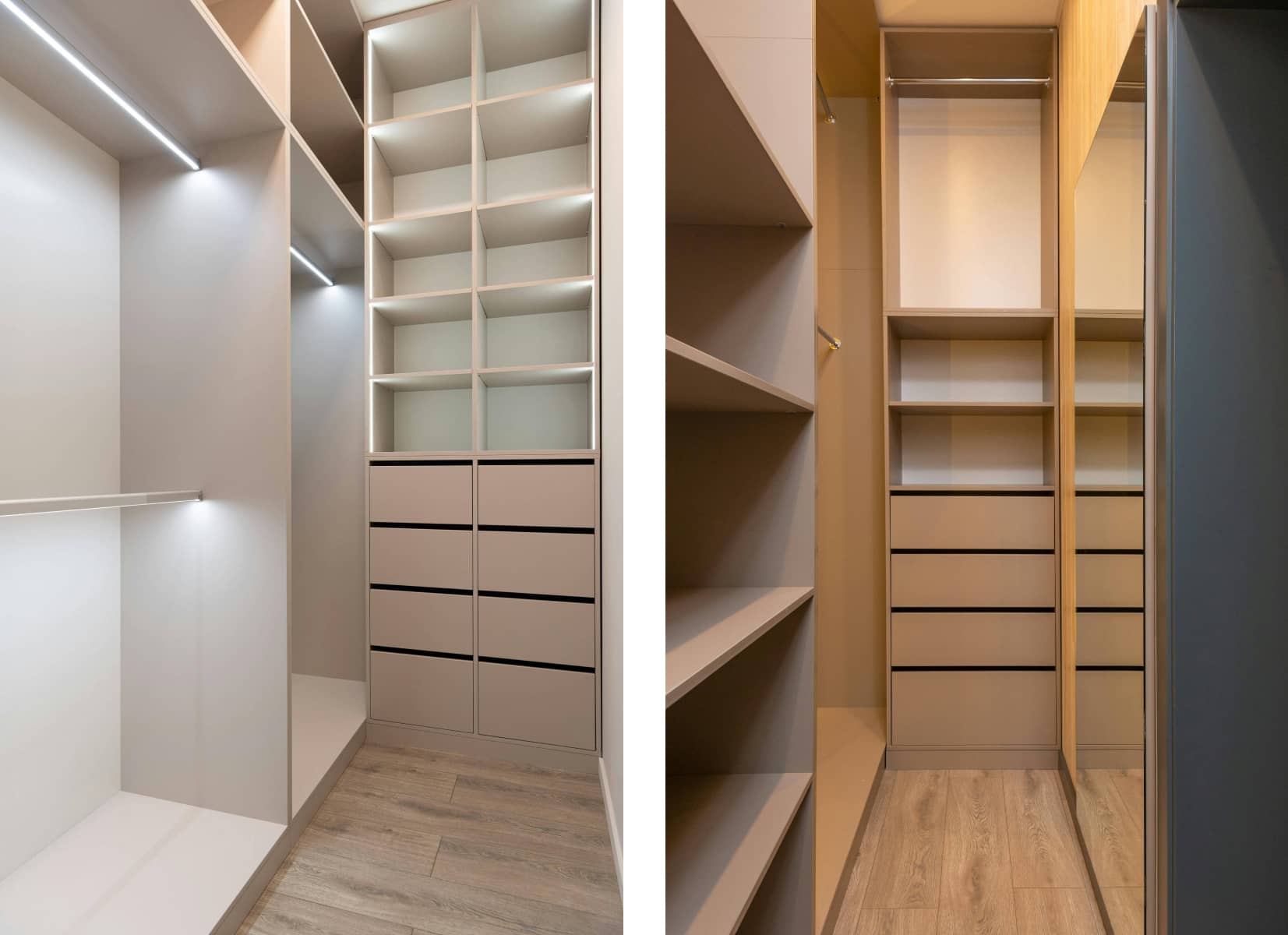 Разнообразные модульные системы — это удобный и гибкий способ организовать гардеробную. Они позволяют изменять конфигурацию в зависимости от вашего комфорта. Попробуйте использовать: