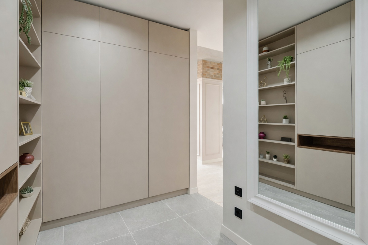 Встроенный шкаф‑купе — практичное решение для хранения. Он монтируется прямо в нишу или отведенное пространство в стене. В зависимости от размеров в нем можно спрятать антресоль для длительного хранения вещей, традиционные полки для одежды и обуви, гардеробную зону и даже водонагреватель и стиральную машину.